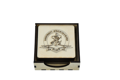 8 onderzetters in een mooi opbergbakje, met logo van ons regiment.