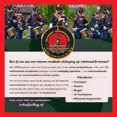 Is dit wat nog op jouw bucketlist staat? Heb jij affiniteit met militaire muziek en speel je op niveau B? Kun je naast concerten ook marcherend musiceren? Meld je dan aan bij het VFKG; het grootste en mooiste vrijwillige muziekkorps van de Nederlandse Krijgsmacht, dat bestaat uit zo'n 75 gedreven muzikanten.